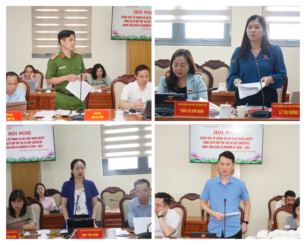 Thực hiện sự phân công của Thường trực Hội đồng nhân dân tỉnh, Ban Pháp chế được phân công chủ trì thẩm tra đối với 07 Tờ trình, dự thảo Nghị quyết, gồm: Tờ trình, dự thảo Nghị quyết sửa đổi khoản 2 Điều 1 Nghị quyết số 22/NQ-HĐND ngày 30 tháng 7 năm 2025 của Hội đồng nhân dân tỉnh Thái Nguyên về Chương trình giám sát năm 2026 của Hội đồng nhân dân tỉnh Thái Nguyên; Tờ trình, dự thảo Nghị quyết thành lập Đoàn giám sát chuyên đề của Hội đồng nhân dân tỉnh về công tác quản lý nhà nước về đất đai trên địa bàn tỉnh Thái Nguyên; Tờ trình, dự thảo Nghị quyết ban hành Quy chế làm việc của Hội đồng nhân dân tỉnh Thái Nguyên Khóa XV, nhiệm kỳ 2026 - 2031; Tờ trình, dự thảo Nghị quyết ban hành Nội quy kỳ họp của Hội đồng nhân dân tỉnh Khóa XV, nhiệm kỳ 2026 – 2031; Tờ trình, dự thảo Nghị quyết ban hành Quy định mức hỗ trợ một số chế độ, chính sách và các điều kiện bảo đảm hoạt động của Hội đồng nhân dân các cấp trên địa bàn tỉnh Thái Nguyên; Tờ trình, dự thảo Nghị quyết quy định tiêu chí thành lập Đội dân phòng và tiêu chí về số lượng thành viên Đội dân phòng trên địa bàn tỉnh Thái Nguyên; Tờ trình, dự thảo Nghị quyết bãi bỏ một số nghị quyết của Hội đồng nhân dân tỉnh Thái Nguyên (trước sắp xếp) và Hội đồng nhân dân tỉnh Bắc Kạn (trước sắp xếp).