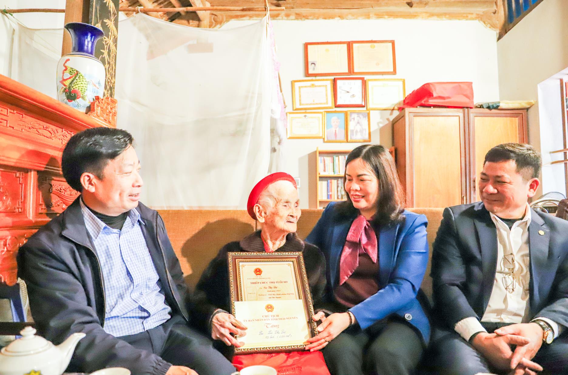 Đoàn thăm gia đình bà Cù Thị Dự, sinh năm 1923, 103 tuổi, thường trú TDP Hợp Thành