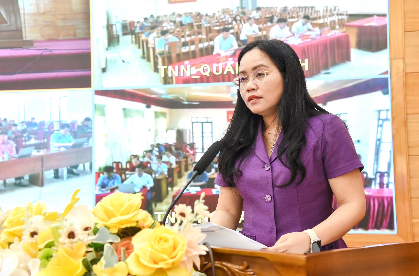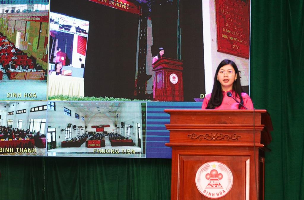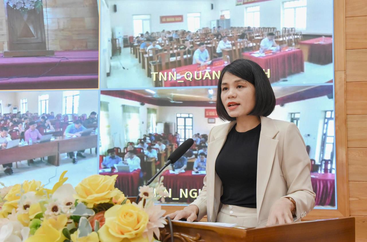 Bà Chu Thị Yến, Chuyên viên phòng Công tác HĐND, Văn phòng Đoàn ĐBQH và HĐND tỉnh Thái Nguyên trình bày Chương trình hành động tại Hội nghị tiếp xúc cử tri xã Định Hóa, tỉnh Thái Nguyên