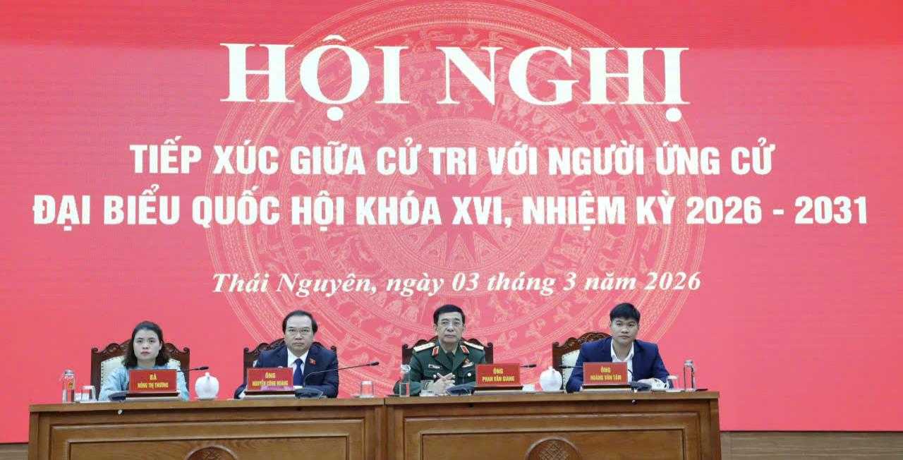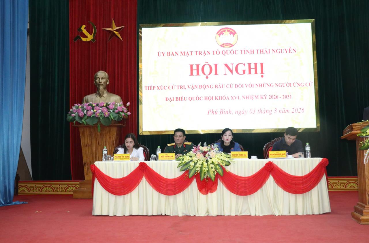 Sáng ngày 03/3/2026, các ứng cử viên đại biểu Quốc hội khóa XVI đơn vị bầu cử số 01 tiếp tục chương trình tiếp xúc cử tri vận động bầu cử trực tiếp tại Hội trường tầng 2 Trụ sở làm việc Đoàn ĐBQH- HDND-UBND tỉnh và kết nối trực tuyến tới các 20 điểm cầu tại các phường: Phan Đình Phùng, Linh Sơn, Quan Triều, Tích Lương, Gia Sàng, Quyết Thắng; các xã: Tân Cương, Đồng Hỷ, Quang Sơn, Văn Lăng, Trại Cau, Nam Hòa, Văn Hán, Võ Nhai, Dân Tiến, Tràng Xá, Nghinh Tường, Thần Sa, La Hiên, Sảng Mộc.