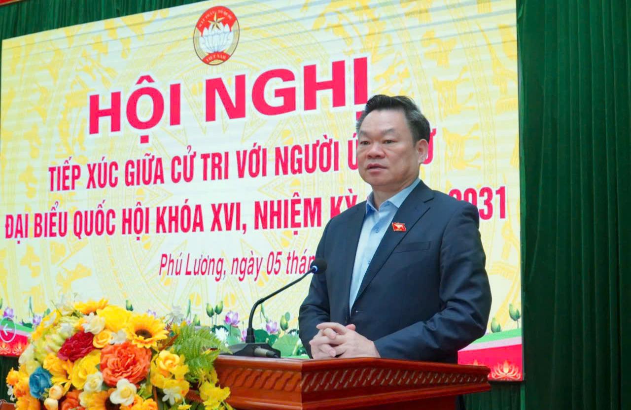 Đồng chí Hoàng Duy Chinh, Ủy viên BCH Trung ương Đảng, Ủy viên BTV Đảng ủy Quốc hội, Ủy viên UBTV Quốc hội, Phó Chủ tịch Thường trực Hội đồng Dân tộc của Quốc hội phát biểu tại hội nghị tiếp xúc cử tri vận động bầu cử tại xã Phú Lương, tỉnh Thái Nguyên