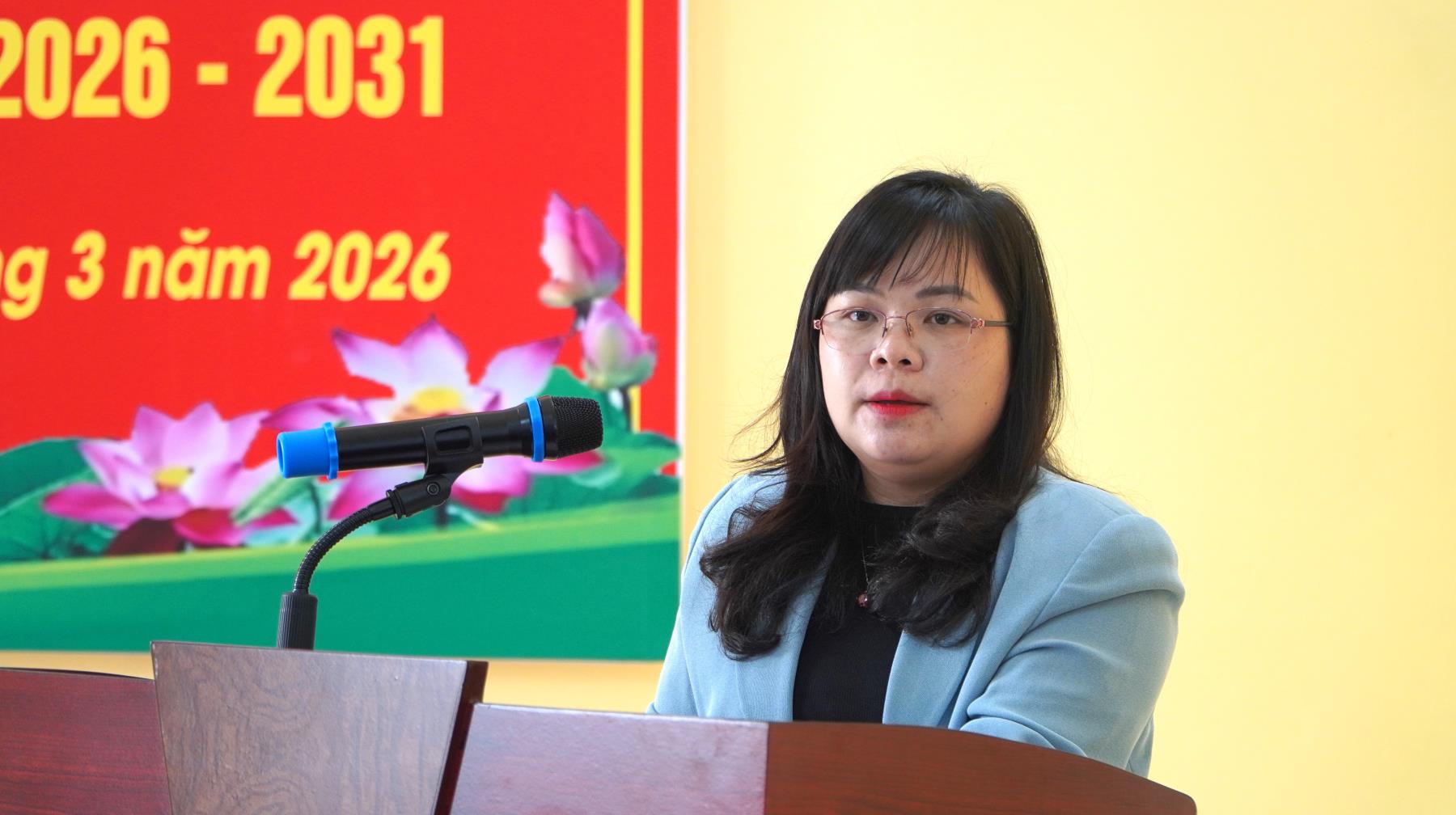 Đồng chí Đỗ Thị Hồng Nhung, Phó Trưởng Phòng Công tác HĐND - Văn phòng Đoàn ĐBQH và HĐND tỉnh trình bày chương trình hành động trước cử tri tại đơn vị bầu cử số 4, xã Chợ Đồn, tỉnh Thái Nguyên
